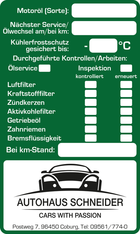 S prilagodljivimi servisnimi nalepkami lahko zabeležite celoten servisni poseg. Izberite potisk, prilagojen vašim potrebam: denimo podatke o datumih, delih ali izdelkih, personalizirane z logotipom. Ker so izdelane iz vremensko odporne folije, prispevajo k boljšemu servisu in organizaciji.