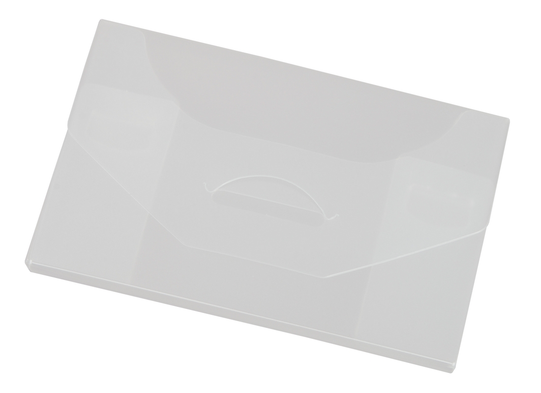 Torbica za vizitke iz prozornega, neškodljivega polipropilena z vstavnim zavihkom za zavarovanje vsebine. V torbico je mogoče spraviti 25 običajnih vizitk. Na voljo sta prozorna in srebrno-črna izvedba.