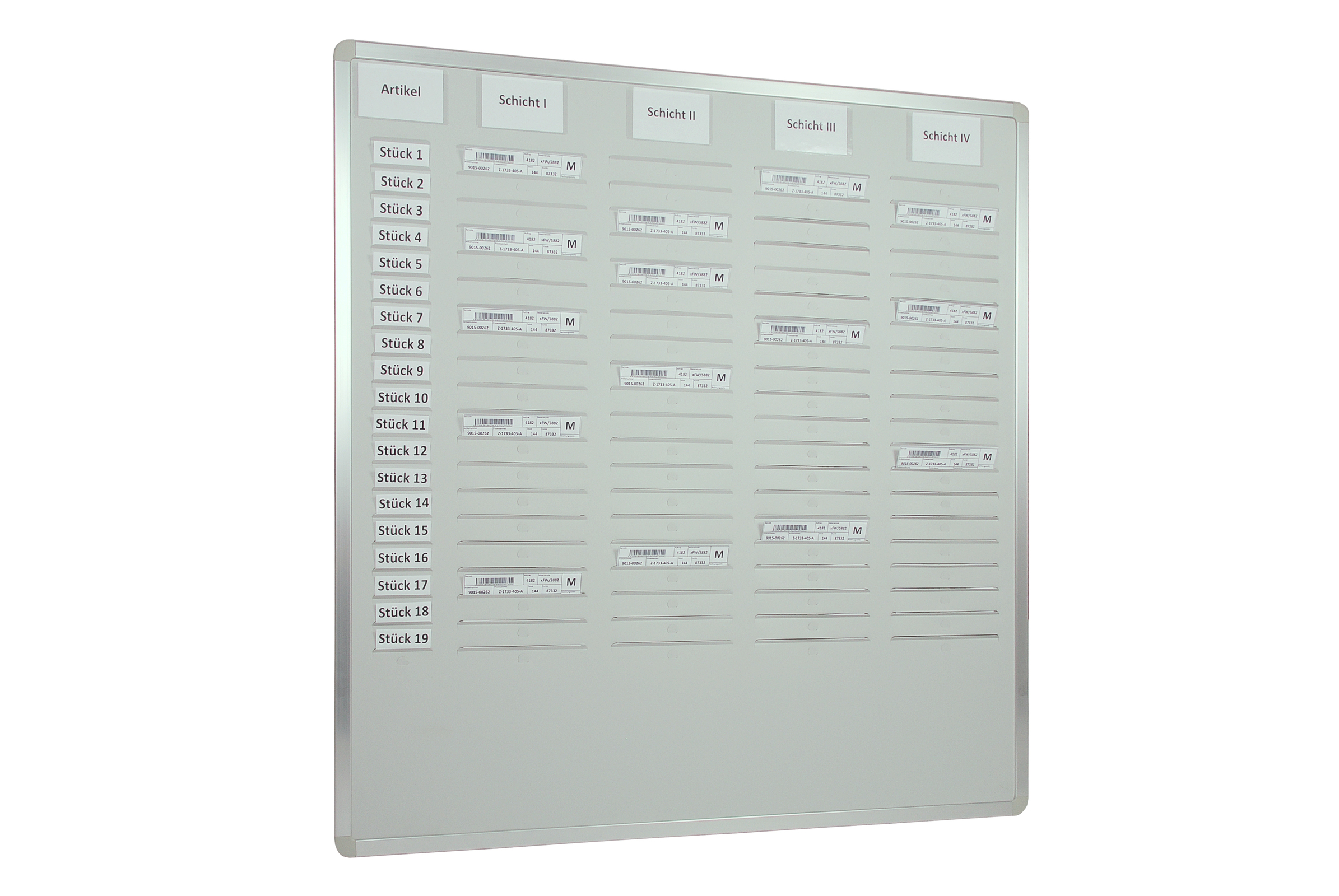 Vstavna tabla "Orga-Easy" za shranjevanje dokumentov velikosti A5, kot so dobavnice, naročilnice, kartice za sistem kanban itn. Osnovni sestavni deli table so iz izjemno lahke nosilne plošče iz trde pene, na katero so nalepljeni vstavni razdelki, obdani z aluminijastim okvirjem s plastičnimi kotniki.
